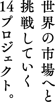 世界の市場へと挑戦していく14プロジェクト。公募により全国から集まった多数のプロジェクトより14件が採択されました。採択プロジェクトに対して、経済産業省「ふるさと名物応援事業費補助金」が交付されるとともに、運営事務局よりネットワークの構築や事業推進のためのアドバイス等、様々な支援が行われます。